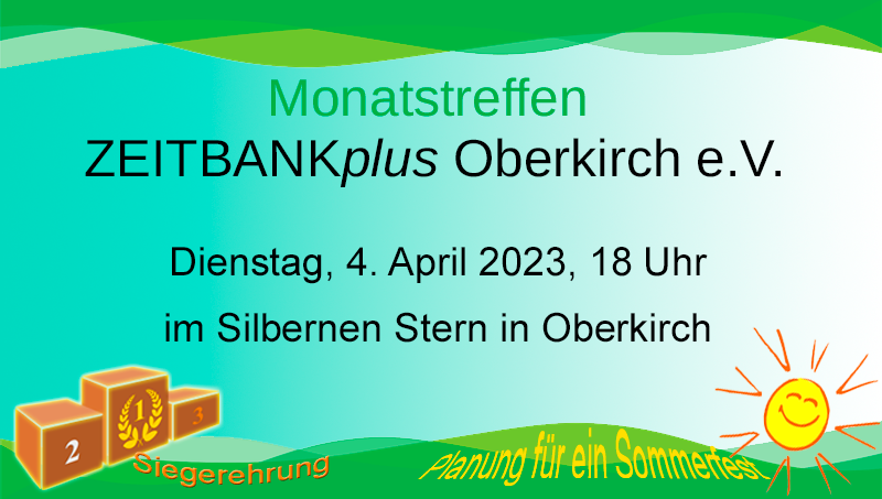 An unserem April-Treffen stehen zwei wichtige Themen an: die Planung für ein Sommerfest und die Siegerehrung für unseren Wettbewerb. Dazu bitte bis spätestens 31. März Euer Stundenkonto prüfen, alle Zeitgutschriften für geleistete Stunden in unser System eintragen!