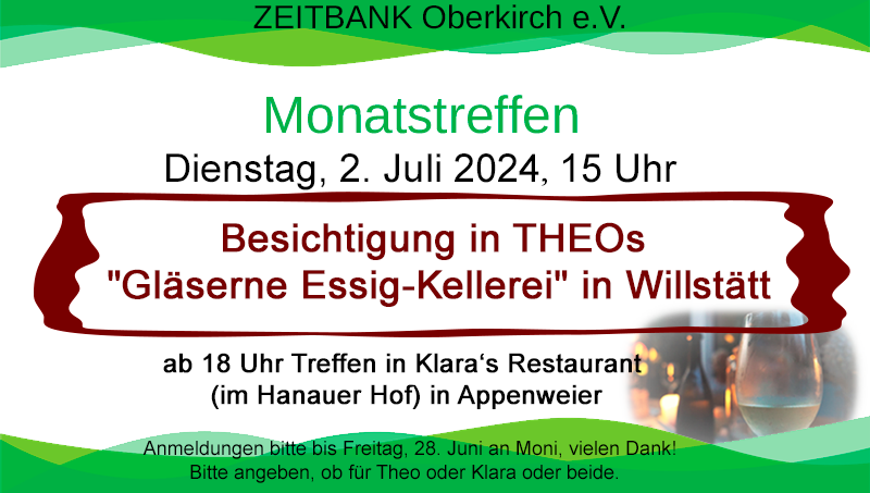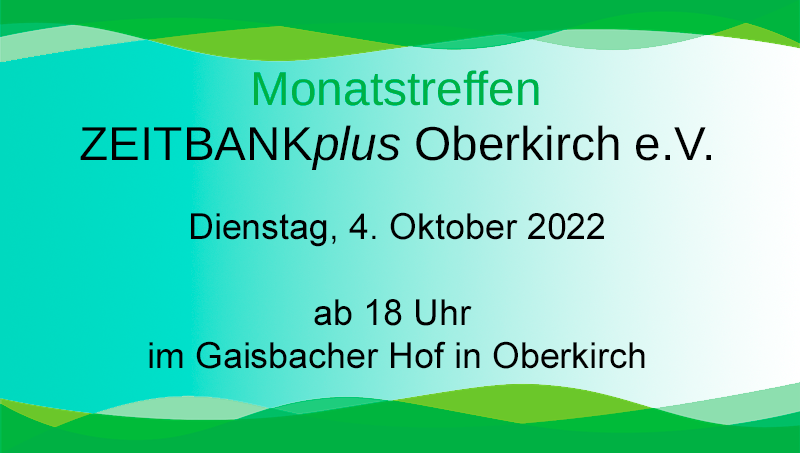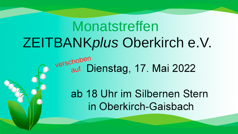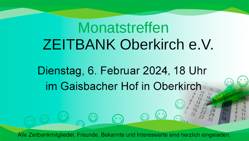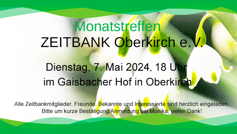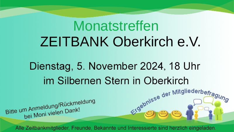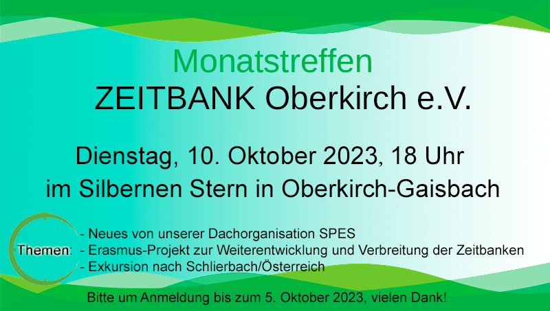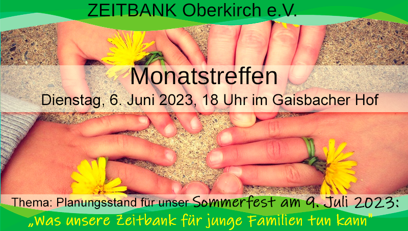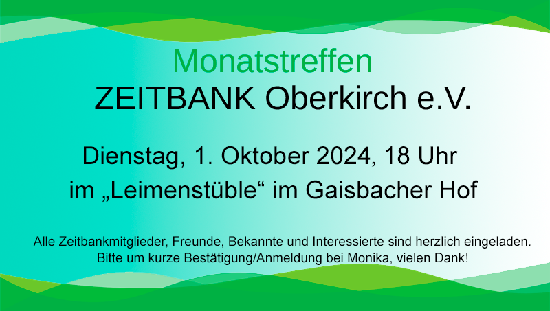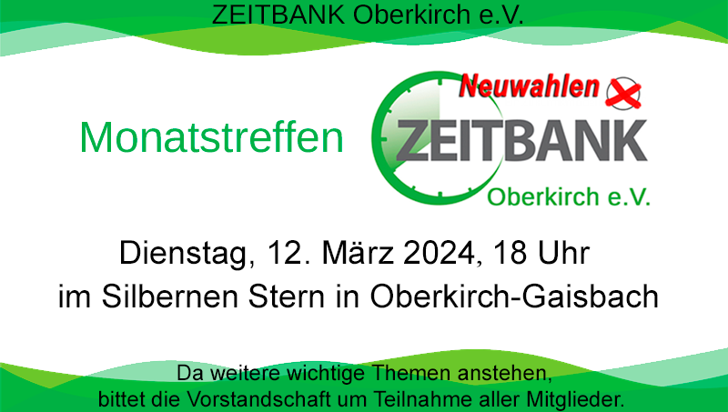 Unser Monatstreffen als öffentliche Informationsveranstaltung mit Frau Vögtlin, Vorsitzende der Zeitbank Lörrach. Eine Einladung hierzu wird auch in der örtlichen Presse zeitnah veröffentlicht.