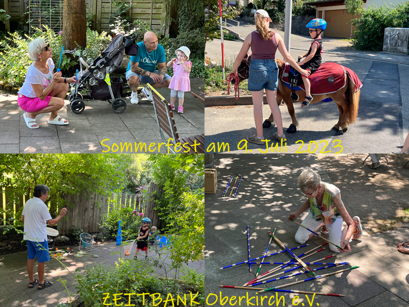 Am Sonntag, den 9. Juli durften die inzwischen fast 30 Mitglieder des Zeitbank Oberkirch e.V. zahlreiche Gäste zu ihrem Sommerfest im „Gaisbacher Hof“ begrüßen. Besonders angesprochen waren Familien mit Kindern. Für die „Kids“ waren zahlreiche Stationen zum Spielen und Erleben aufgebaut worden. Besonders das Pony-Reiten fand regen Anklang und voller Stolz präsentierten sich die „Kleinen“ hoch zu Ross. Aber auch die „Großen“ hatten viel Spaß bei interessanten Spielen.