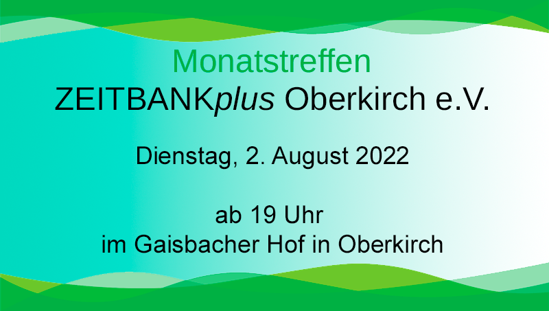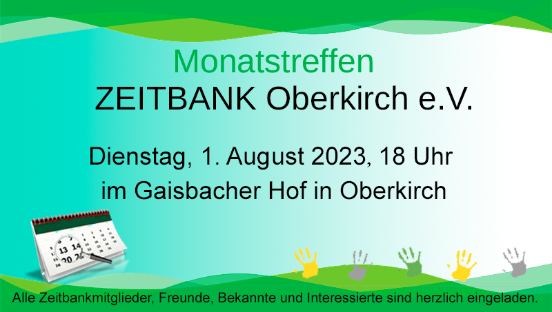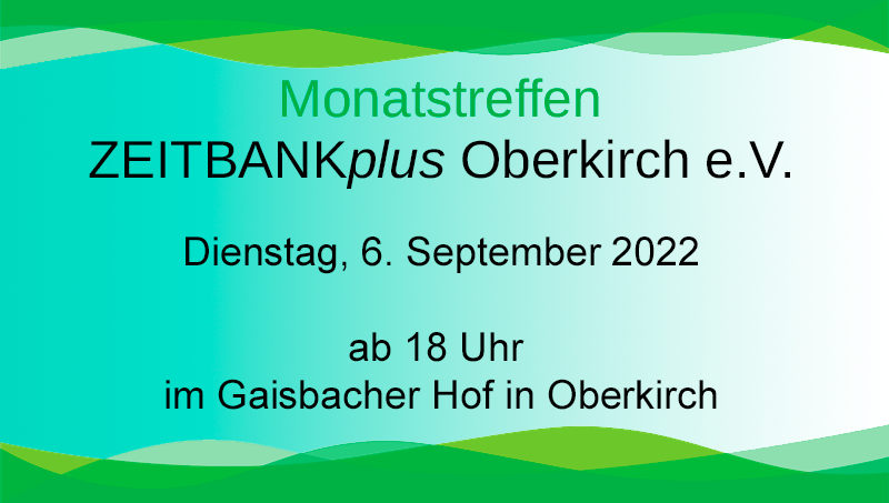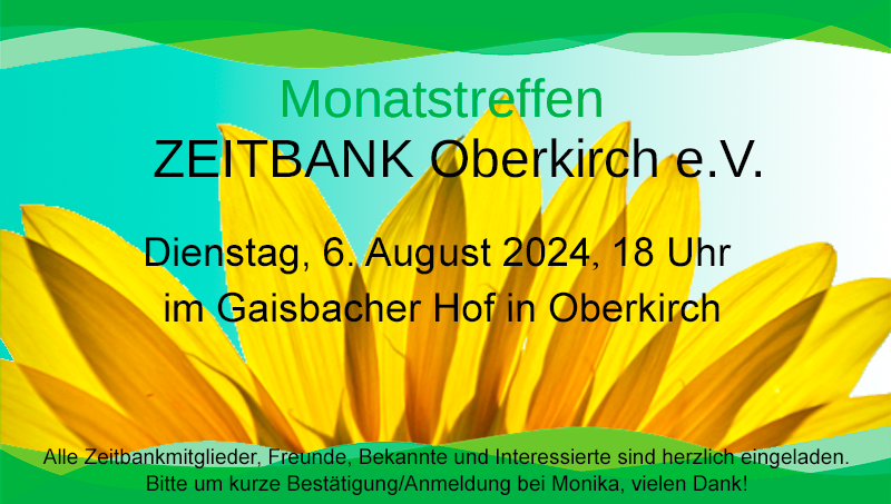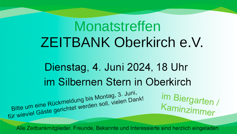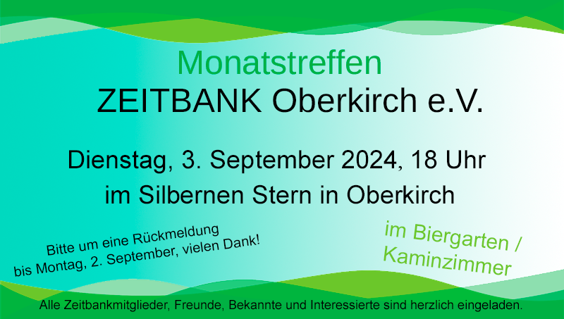 Zu unserem Monatstreffen treffen wir uns am Dienstag, 3. September um 18 Uhr im Silberner Stern. Alle Zeitbank-Mitglieder, Partner, Freunde und Bekannte sind herzlich eingeladen.
