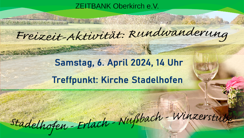 Carola und Hans haben eine kleine, gemütliche Wanderung vorbereitet. Am Samstag, 6. April 2024, treffen wir uns um 14 Uhr bei der Kirche in Stadelhofen. Gegen 17 Uhr sind auch alle, die nicht mitlaufen können oder wollen, in der Winzerstube in Nußbach herzlich eingeladen.